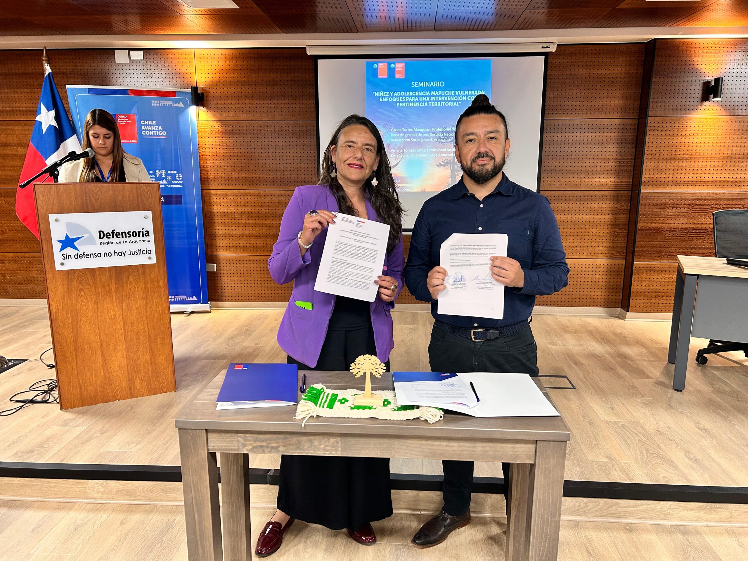 En el marco de esta actividad se llevó a cabo la firma de un convenio de colaboración entre ambas instituciones, orientado a fortalecer el trabajo intersectorial y la promoción de intervenciones con pertinencia cultural en la región. La ceremonia fue encabezada por el Subdirector Nacional Sur de Conadi, Gonzalo Peña Ávila y la Directora Regional del Servicio de Protección de la Niñez, Ximena Oñate.